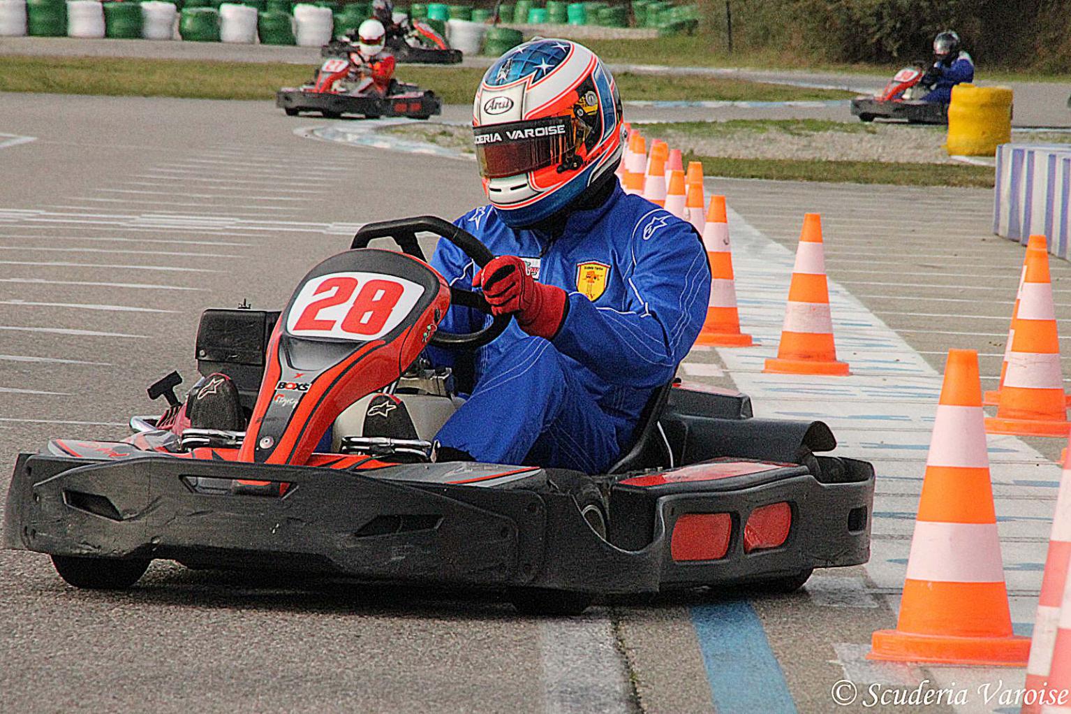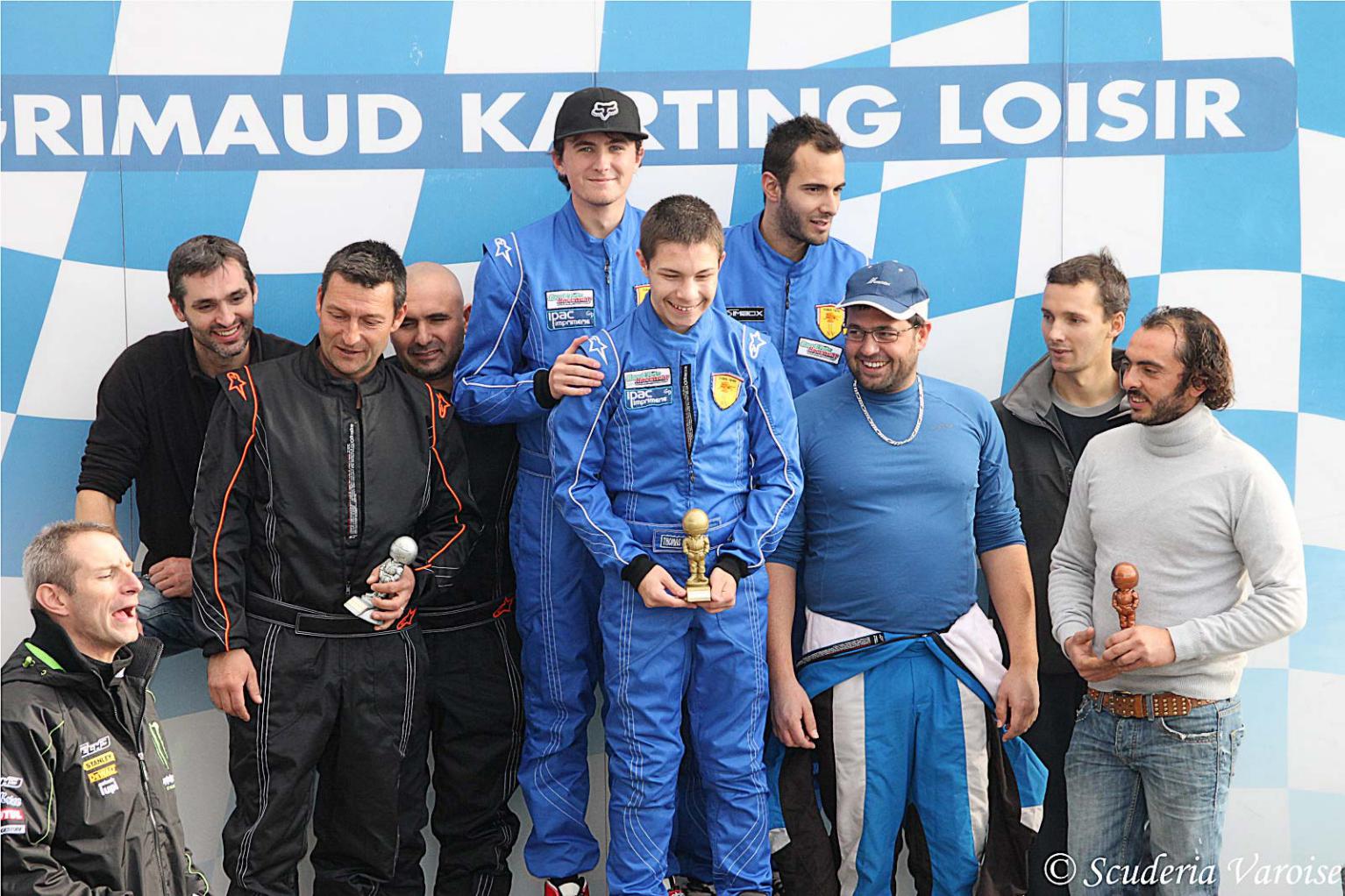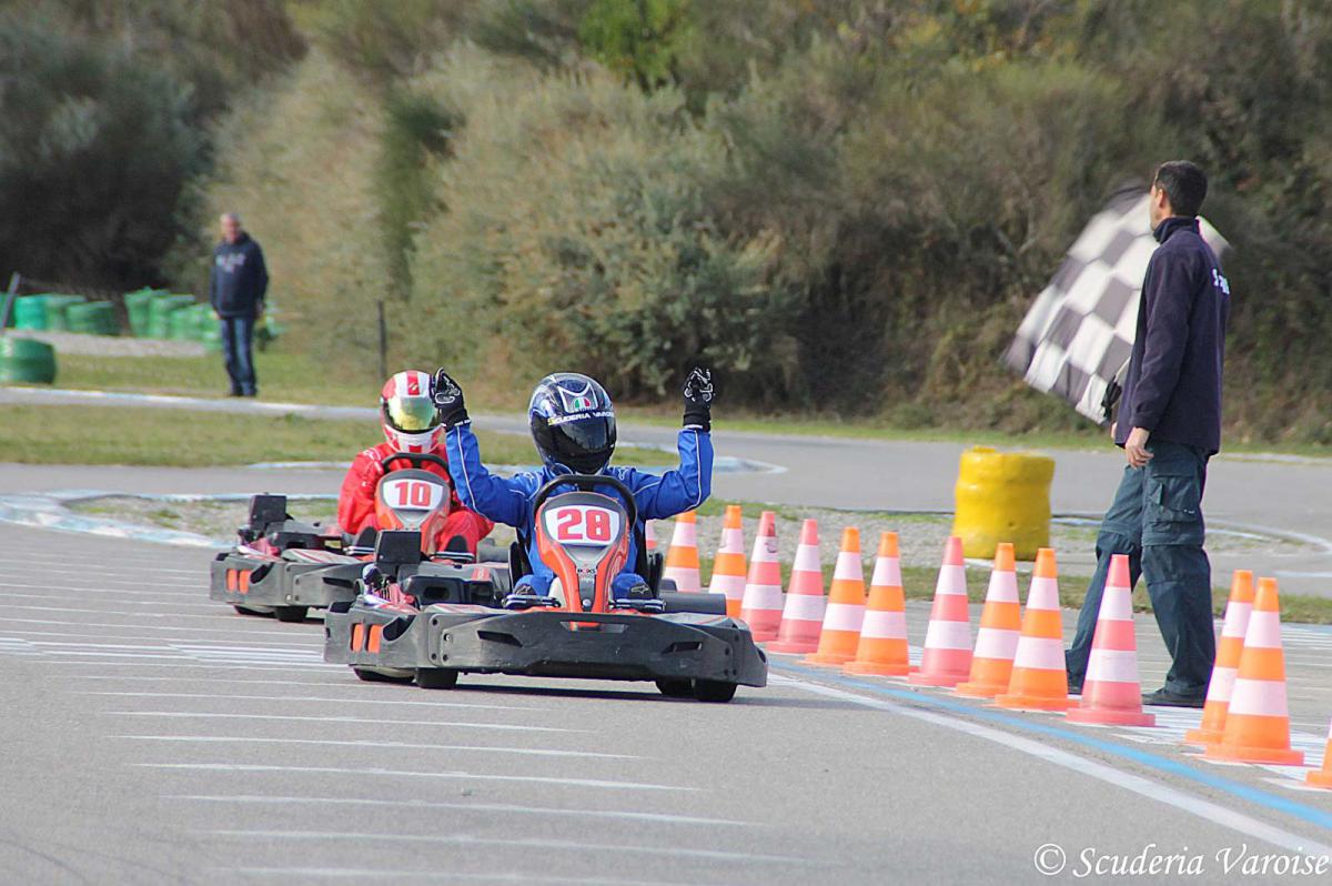 La direction de course annonce un départ type « Le mans » pour lancer cette 3ème manche du championnat. La Scuderia Varoise est 2ème sur la grille de départ et c’est Mathieu qui effectuera le premier relai. A la baissé du drapeau, les pilotes s’élancent vers leur kart et Mathieu va réaliser un excellent départ puisqu’il passe seul en tête le premier virage. Grâce à de très bons chronos, le pilote de la SV creuse l’écart sur ses poursuivants tours après tours et rejoint rapidement l’arrière de la course. Après quelques dépassements sur les retardataires, Mathieu se jette dans la voie des stands afin de laisser le volant à Christophe. Ce dernier ressort dans le trafic et va effectuer de nombreux dépassements durant son relai. Il parvient malgré tout à garder un très bon rythme de course et va lui aussi conforter cette première place pour la Scuderia Varoise. Les très bons chronos de Mathieu (48.778) et Christophe (48.928) permettent à la SV de virer largement en tête avant le dernier relai de Thomas. Le jeune pilote varois va réaliser un relai final à la fois très propre en assurant tous ses dépassements mais aussi très rapide puisqu’il réalise un meilleur temps de 49.252. Le directeur de course agite le drapeau à damier et la Scuderia Varoise passe la ligne d’arriver en tête avec plus de 30 secondes d’avance sur ses poursuivants « Les fous du volant » et « Team GT » qui complète le podium respectivement 2ème et 3ème . Le jeune Thomas ne manque pas de célébrer cette belle victoire les bras vers le ciel devant le sourire de ses coéquipiers.